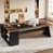 About This ProductWelcome the perfect blend of style and functionality to your workspace with our 78'' L-shaped Executive Desk.Constructed with a thickened desktop, the desk ensures sturdiness while lending a touch of sophistication with its walnut and black finish. Its practical design incorporates two storage drawers and a file cabinet that silently open and close thanks to the sliding rail feature. This feature ensures your work environment remains calm and distraction-free whilst offering adequate storage for your office supplies and important files.The additional feature of a privacy baffle adds a touch of personal space during your work hours, while the open storage shelves serve as a perfect place for your books or decor items.Not Included:Office ChairFeaturesSpacious Workspace: Boasting dimensions of 78.74''L x 55.11''W x 29.53''H. This desk offers an expansive workspace, from bulky monitors and laptops to books, documents.Versatile Storage: Comes equipped with two storage drawers and a file cabinet, providing plentiful room for all your office supplies and important documents.Quality Construction: The thickened desktop design provides extra sturdiness whilst enhancing the desk's lifespan.Aesthetically Pleasing: The walnut and black finish lends a chic yet professional edge to the table, ensuring it matches with any office decor.Privacy Baffle: Added to prevent others from sneak peek or invasion of personal privacy during work.Open Storage Shelves: The design incorporates open storage shelves for easy accessibility and display of books or decor items.Easy Assembly: The console table comes with all necessary hardware and instructions for a simple assembly process.Show More